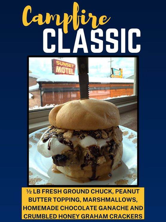 1/2 lb. Fresh Ground Chuck, Peanut Butter Topping, Marshmallows, Homemade Chocolate Ganache and Crumbled Honey Graham Crackers.
