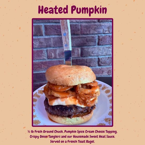 1/2 lb. Fresh Ground Chuck, Pumpkin Spice Cream Cheese Topping, Crispy Onion Tanglers and our Housemade Sweet Heat Sauce.